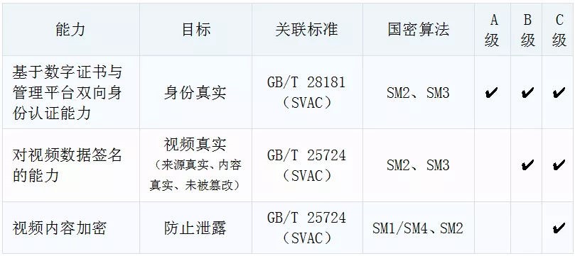 C級:在A級和B級技術(shù)要求的基礎(chǔ)上,增加視頻數(shù)據(jù)加密的能力,使視頻數(shù)據(jù)在確保身份真實、視頻來源于真實設(shè)備、能夠校驗視頻內(nèi)容是否遭到篡改的基礎(chǔ)上,達到對視頻內(nèi)容加密保護的目標。