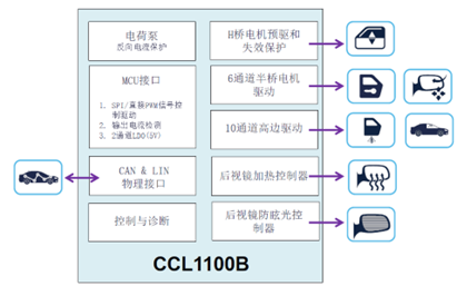 公司本次內(nèi)部測(cè)試成功的集成化門區(qū)驅(qū)動(dòng)控制芯片產(chǎn)品CCL1100B是用于汽車電子門區(qū)驅(qū)動(dòng)控制專用芯片,集成的功能主要包括:1、多達(dá)6路直流電機(jī)驅(qū)動(dòng),其中5路內(nèi)置功率管,用于后視鏡調(diào)節(jié)、折疊及門鎖驅(qū)動(dòng)等功能,極大減低了客戶端應(yīng)用成本,另外1路是內(nèi)置預(yù)驅(qū)的H橋馬達(dá)控制模塊,用于升降窗功能;2、多達(dá)10路高邊驅(qū)動(dòng)器(可驅(qū)動(dòng)燈泡,LED和防眩光元件),所有高邊驅(qū)動(dòng)均支持高輸入電容的LED模組恒流模式;3、集成后視鏡加熱驅(qū)動(dòng);4、反眩光控制;5、豐富的物理通訊接口,包括CAN FD和LIN;6、豐富的電源模塊,為系統(tǒng)MCU和外部負(fù)載(如傳感器)提供電源;為了滿足綠色應(yīng)用需求,該芯片支持兩種低功耗模式,具有可編程的本地和遠(yuǎn)程喚醒能力。該芯片還內(nèi)置強(qiáng)大的熱管理模塊,滿足各種功耗應(yīng)用場(chǎng)景;MCU通過(guò)SPI接口與CCL1100B進(jìn)行通信和控制。